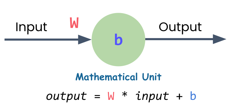 A single neuron is just a linear equation. That’s the equation for a straight line. The neuron needs to find the right values for W (weight) and b (bias) to create the best-fitting line through all the data points.